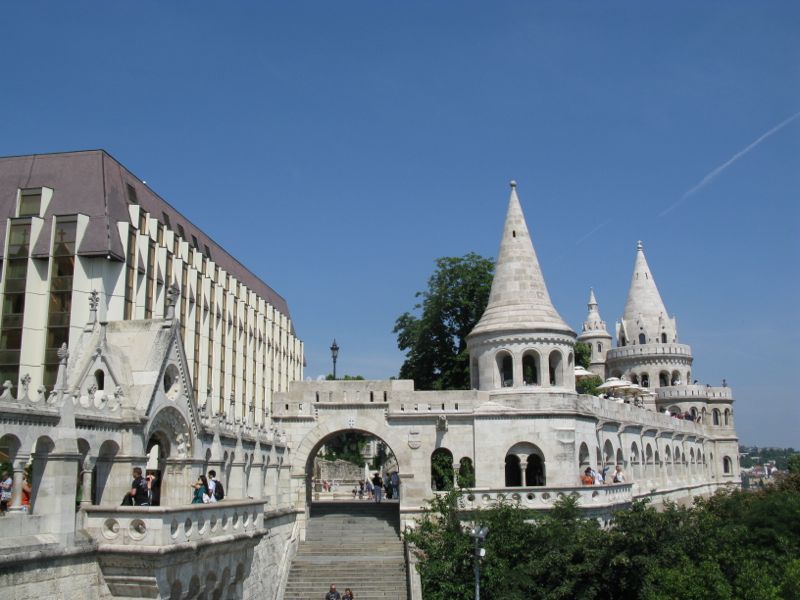 Budapest_8 Buda Hill Budapest_9 Buda Hill Budapest_11 Buda HillThis is the Turul Bird, a mythical bird of Magyar folktales, which supposedly led the Hungarian migrations “from the steppes of Central Asia in the ninth century.  He dropped his sword. . . indicating that this was to be the permanent home of the Magyar people. . . and remains a symobl of Hungarian pride.” This is at the entrance into the Royal Palace plaza on the Danube side, near this gate:Budapest_11a Buda HillBudapest_Gate1Budapest_gate stairs Budapest_12 Buda HillA mildly hot day, we walked to the very end of the upper area near the Royal Palace (below, home to several museums which we didn’t see) to a long promontory which gives a great views of Pest, the flatland city. Apparently, this hill is “considered one of the last foothills of the Alps” so everything before is a part of the “Great Hungarian Plain.” (quotes from our Rick Steves’ guidebook)  That bridge to the left is the Chain Bridge, which we’ll walk on on our last day.