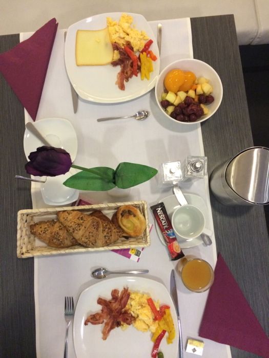 Zichy Breakfast Our breakfast. We learned to use a roll basket to bring our choices to the table. Of course, we normally have this kind of spread at home.  Right.