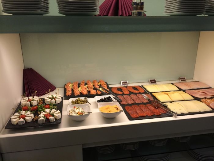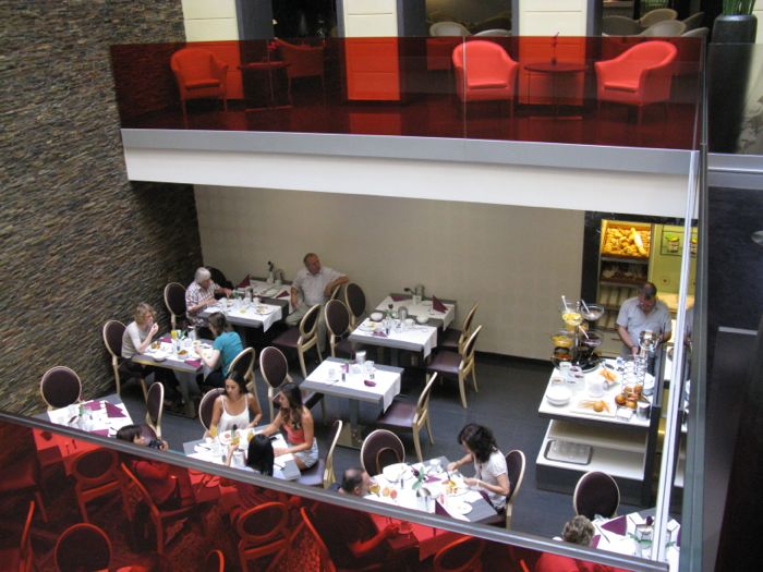 Zichy Breakfast_areaWe start this day with breakfast, which is the lower level, but open to the main floor.  This is looking down into the eating area.  What follows are all the different stations and possibilities for breakfast.