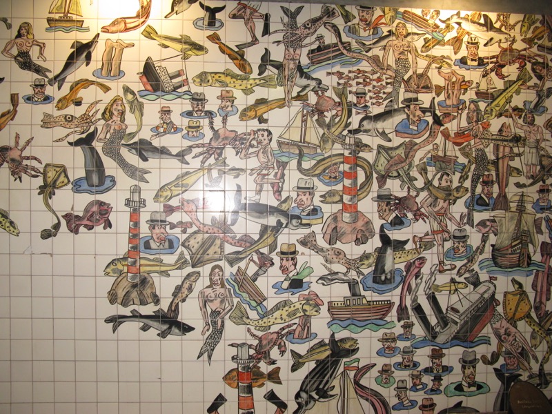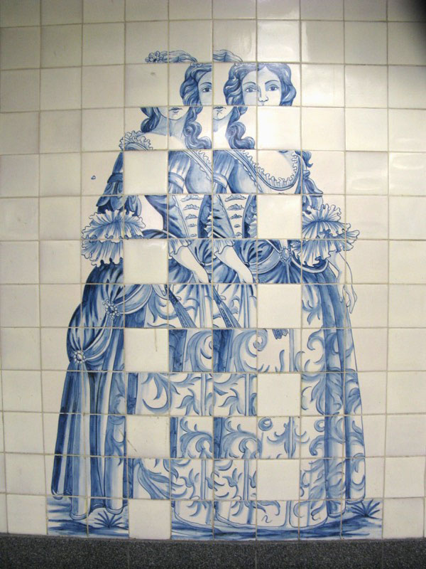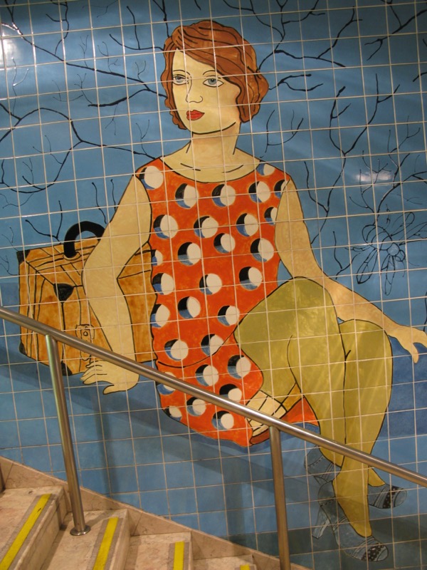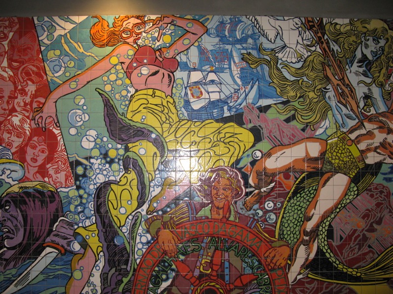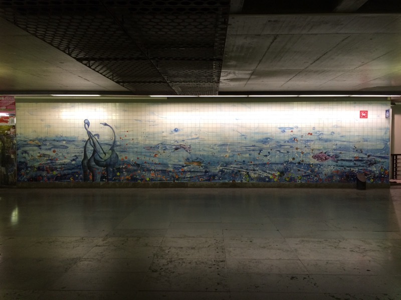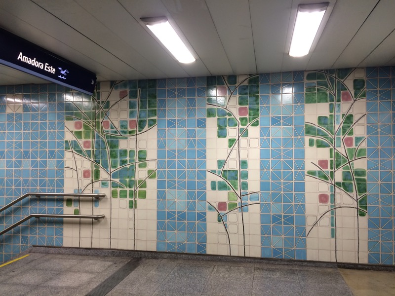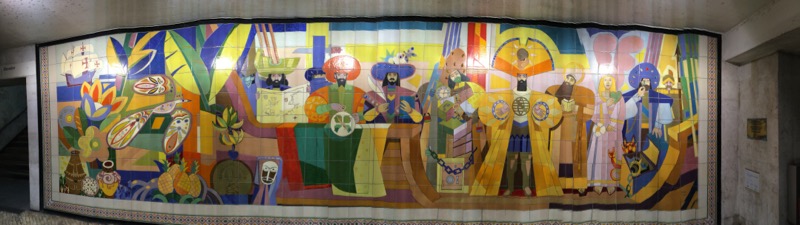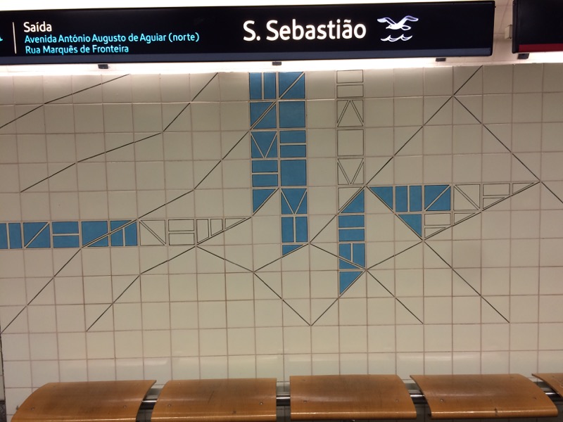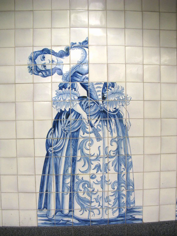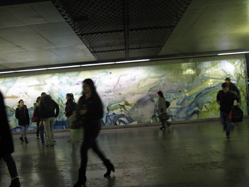 Martim Moniz–a station near a plaza dedicated to martyred Christian soldier. Apparently some of this is plastic on top of tiles, but it felt like tiles to us.