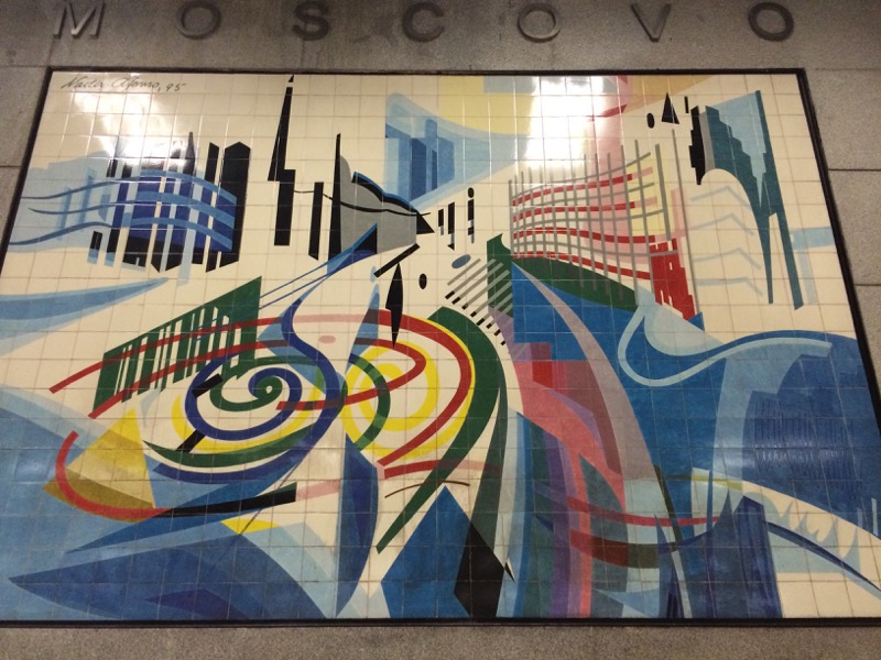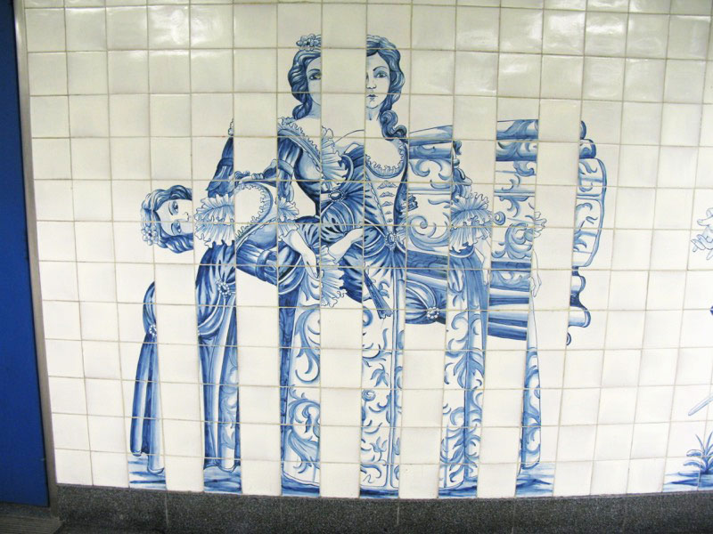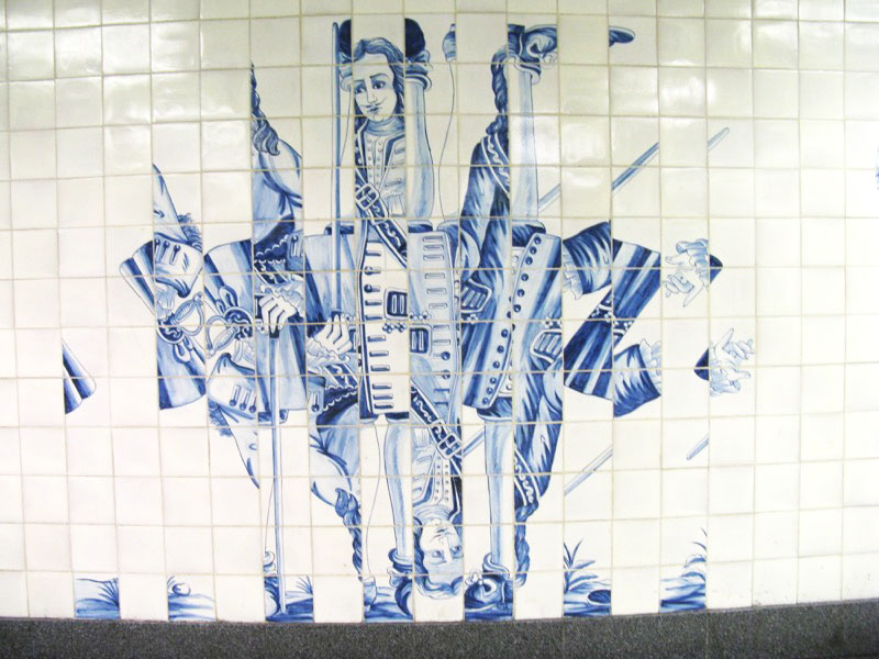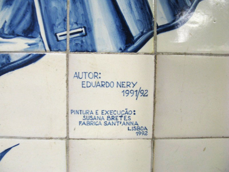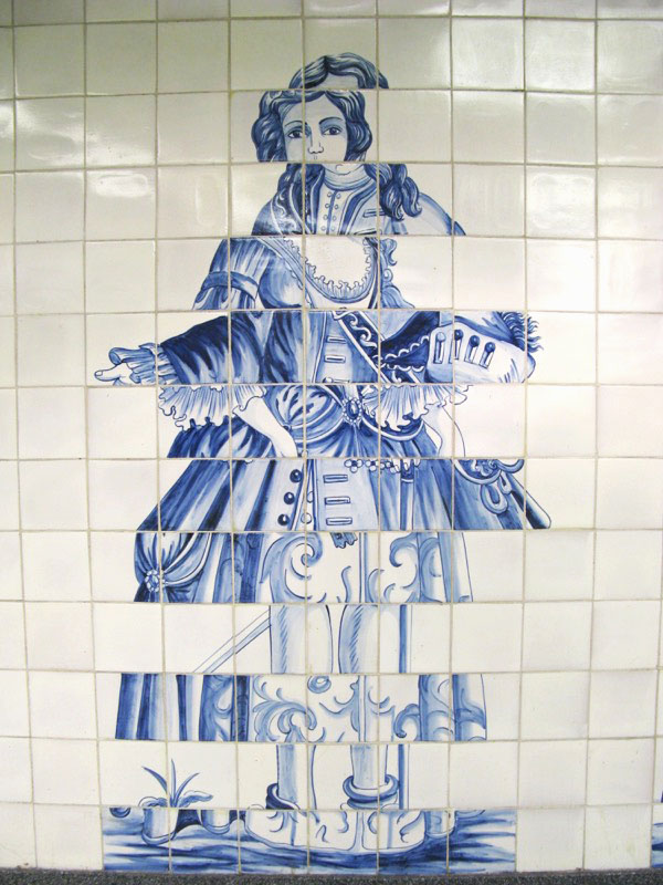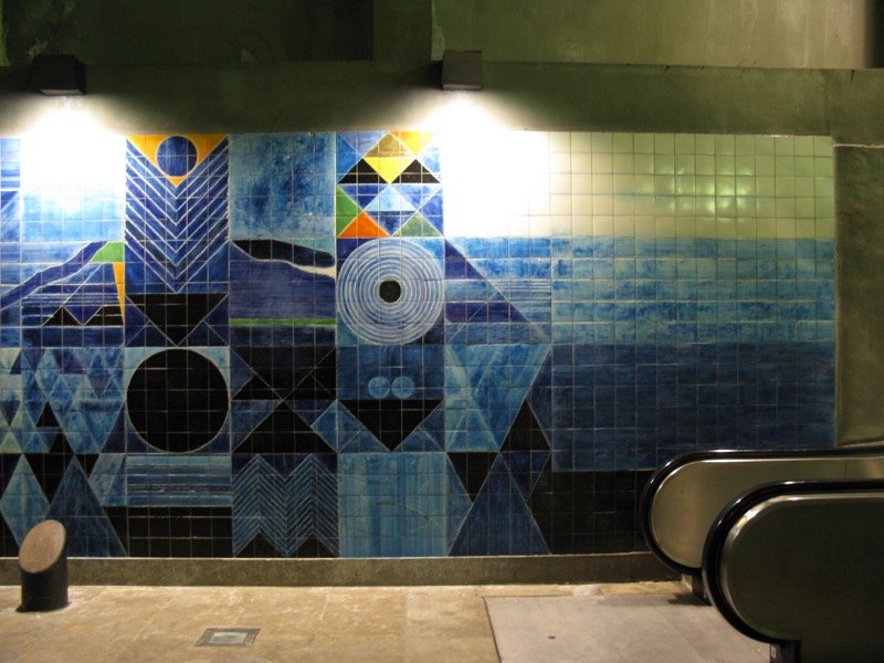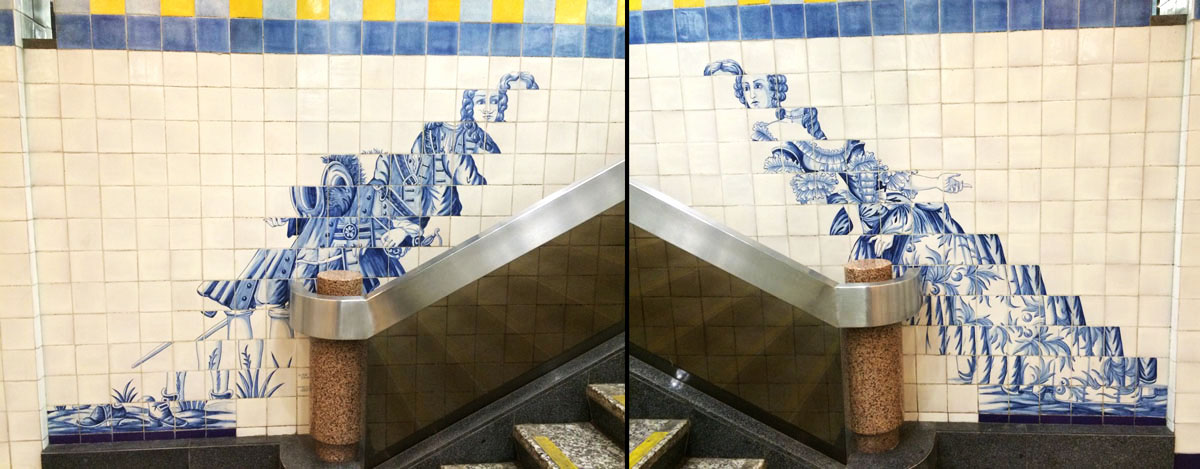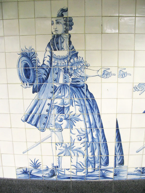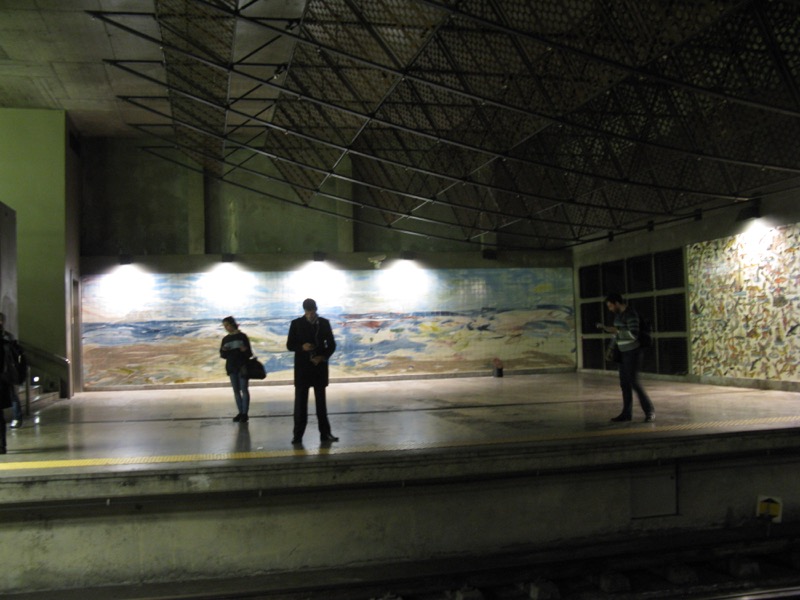 And now, the final station, Campo Grande. Again, from the official website: “Campo Grande station opened in 1993. Its walls are covered in painted tiles by Eduardo Nery, whose work interprets the typical 18th century tile motifs known as figuras de convite or welcoming figures.” They had an example of his work in the Tile Museum, and in an interview with him in the movie, he said he went over to supervise the installation of the tile in the Metro. When one of the workers asked him if he was worried that they would install the tile wrong, he replied, “I’m worried that you will install it correctly.”