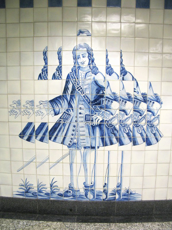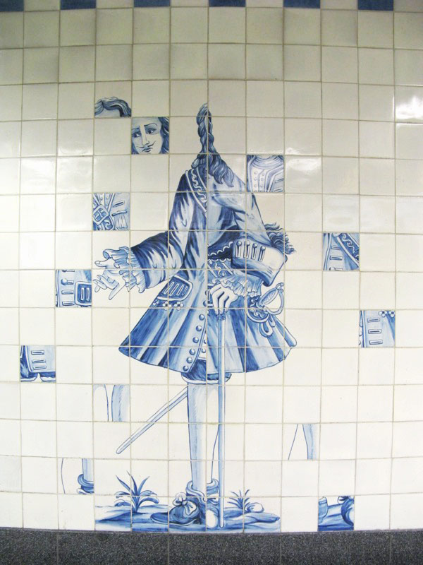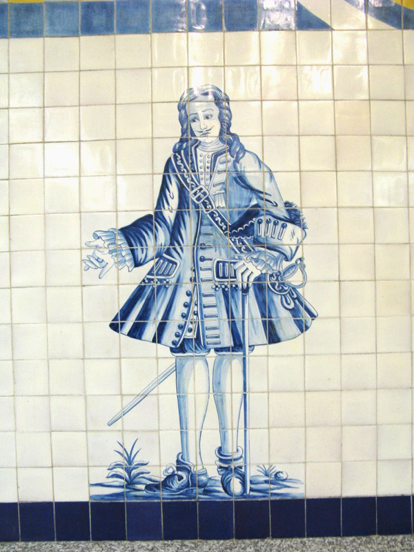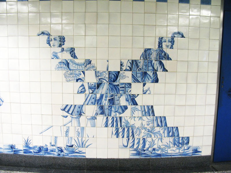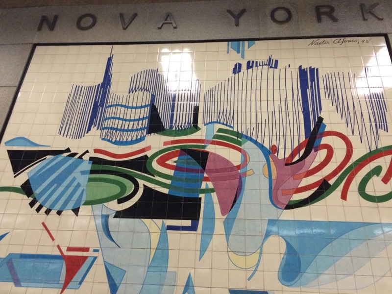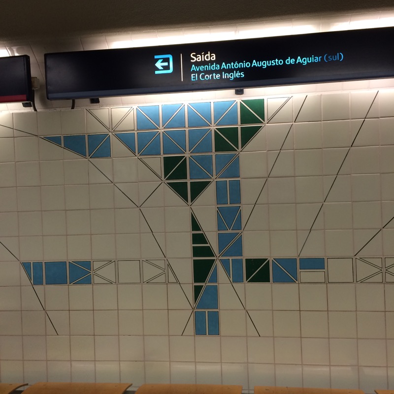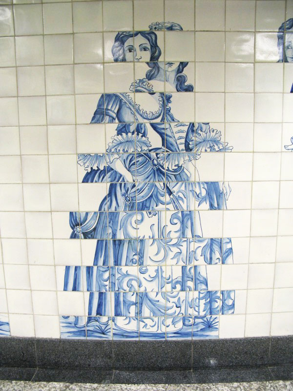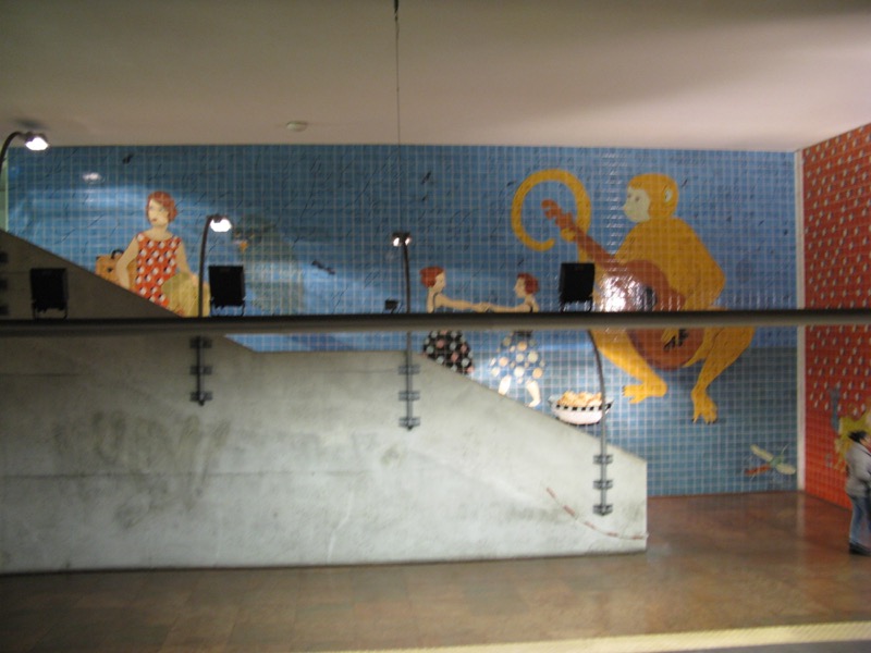 And now, the final station, Campo Grande. Again, from the official website: “Campo Grande station opened in 1993. Its walls are covered in painted tiles by Eduardo Nery, whose work interprets the typical 18th century tile motifs known as figuras de convite or welcoming figures.” They had an example of his work in the Tile Museum, and in an interview with him in the movie, he said he went over to supervise the installation of the tile in the Metro. When one of the workers asked him if he was worried that they would install the tile wrong, he replied, “I’m worried that you will install it correctly.”
