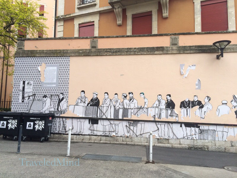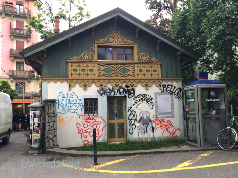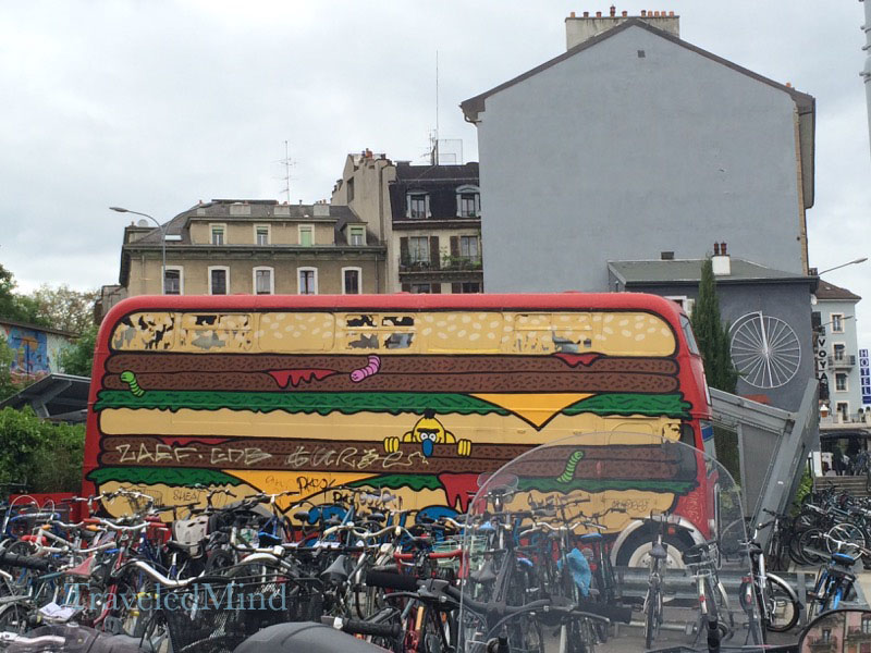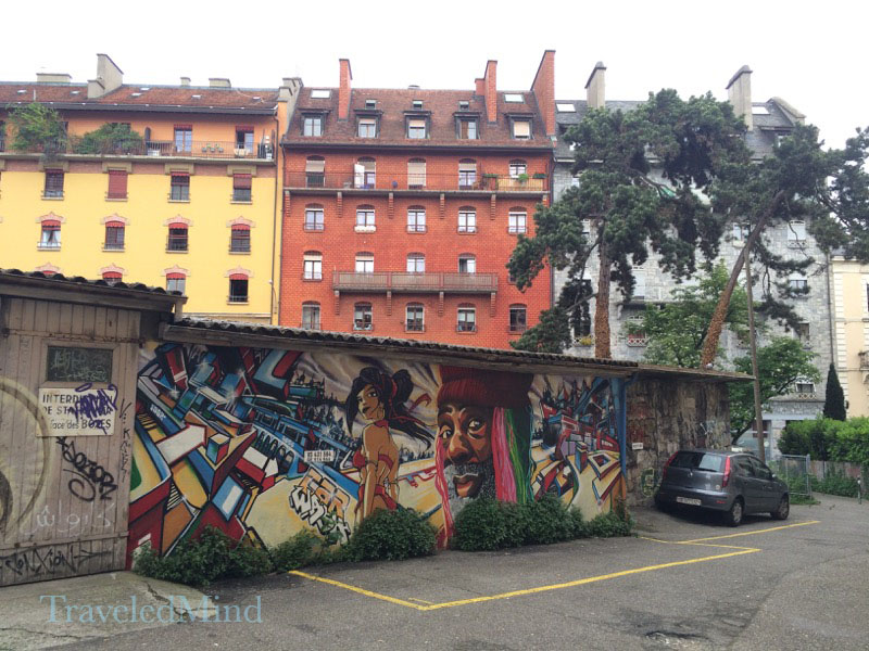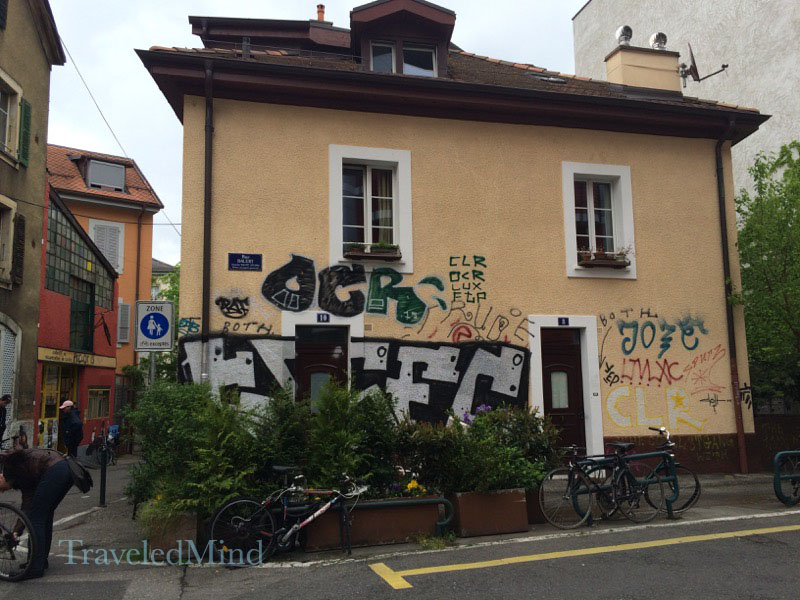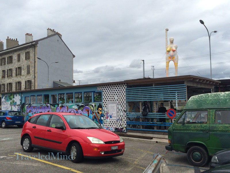 Les Grottes is an area of Geneva directly above the train station (Gare Cornavin) of interesting architecture known as Les Schtroumpes, or The Smurfs, as well as another set of buildings called The Caves (after a river that used to flow through here). It’s also a bohemian neighborhood with tagged buildings, run-down areas, impromptu sculpture, which is a vast change from Geneva’s button-down, cleaned up general atmosphere.