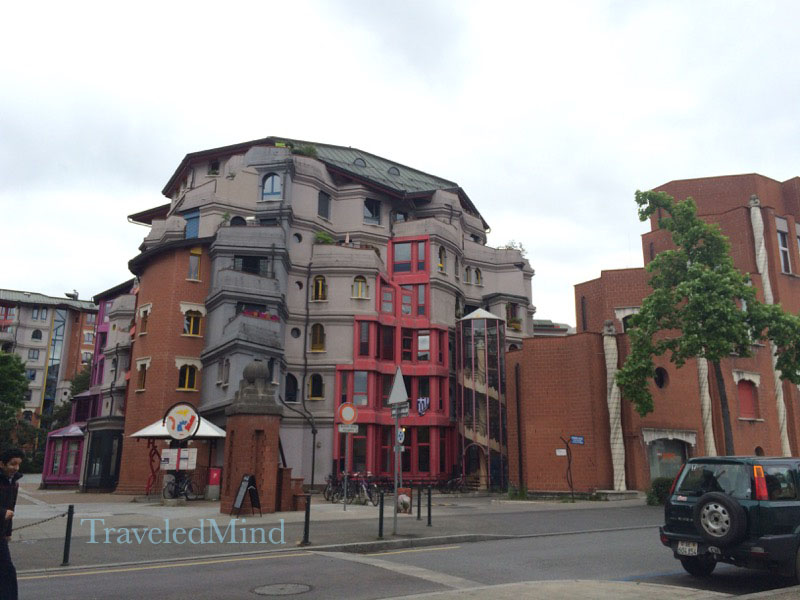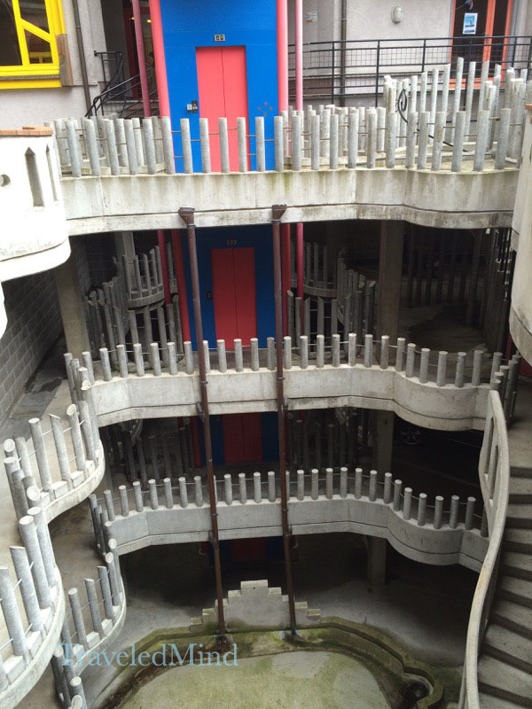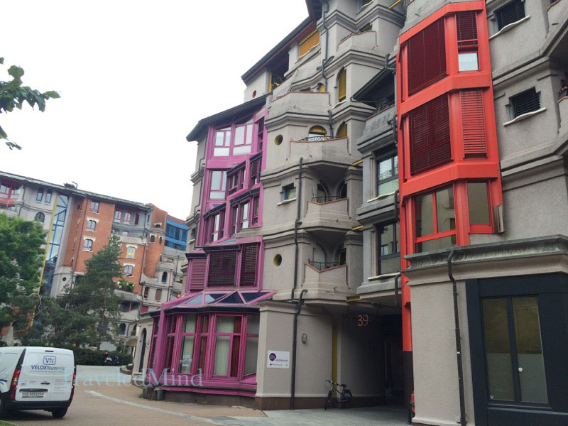 The Swiss architects — Christian Hunziger, Robert Frei and Georges Berthoud, built these between 1982 and 1984; the four Schtroumpf buildings contain 170 city-subsidized apartments for rent. (I found most of the information in English from the Newly Swissed website.)