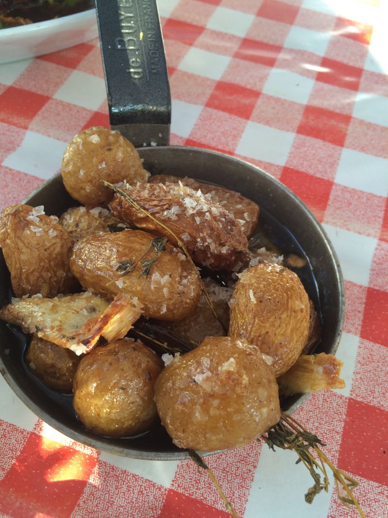 Roast potatoes sprinkled with fleur de sel: a winner. The buttery juice underneath had whole cloves of cooked garlic floating in it. Dave said these reminded him of the time we were in Lyon, buying food at the street market (marche); the rotisserie chicken sellers would rack up their birds, letting the juices drip down below to a catch basin, which was full of potatoes, being basted by the chicken drippings and juices. Agree.