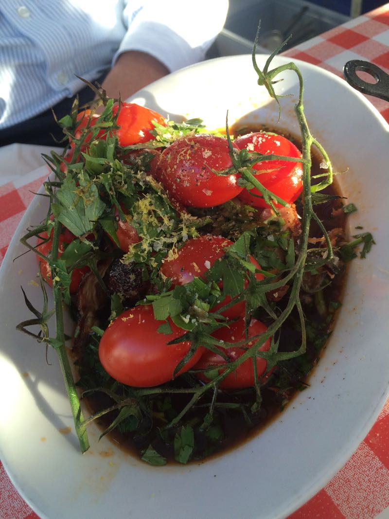 This was porchetta (stuffed pork chop) with those delectable tomatoes on a vine that you can find in Europe, but not so much where I live. The tomatoes were lightly cooked, so they were warm and juicy, but not mush.