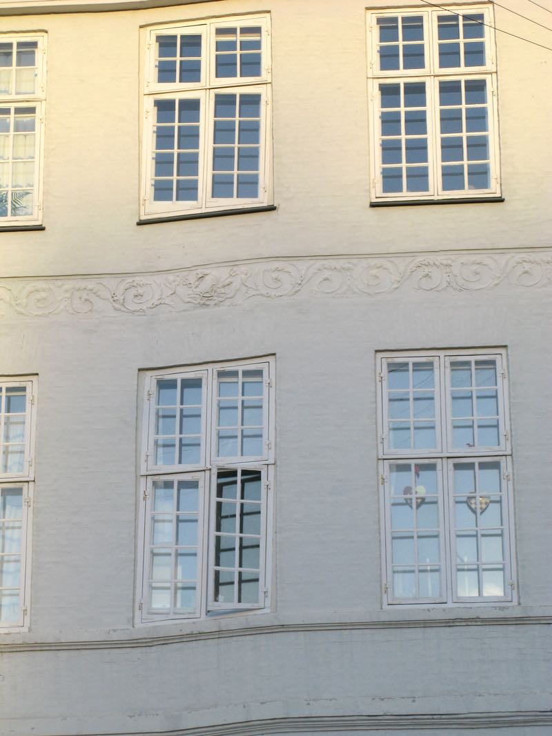 This older house has shifted: notice those crooked windows in the middle. We turn right on Gothersgade (does “gade” mean street?) and continue walking. I show Dave all the red brick buildings I saw earlier.