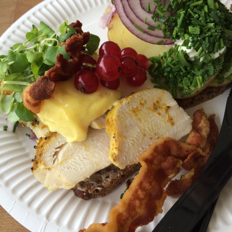 We ended up with three: the potato/onion/crispy onions (above), the roast pork with watercress, bacon and berries (below), and…