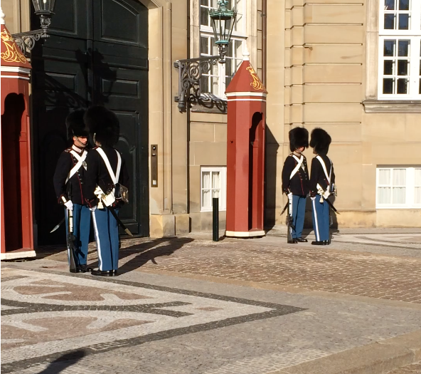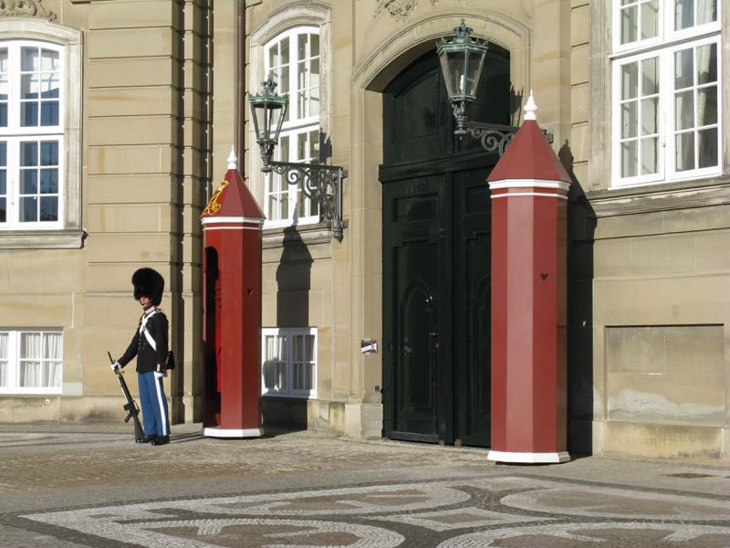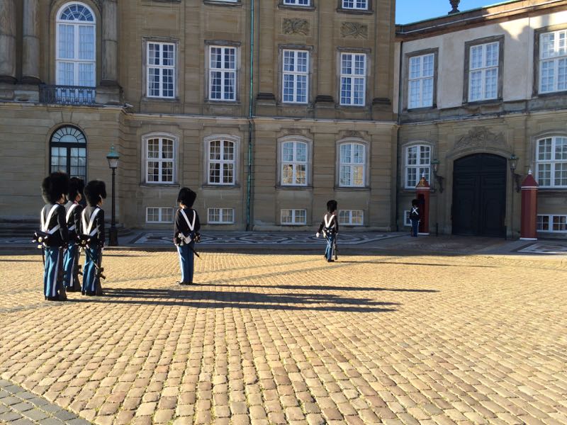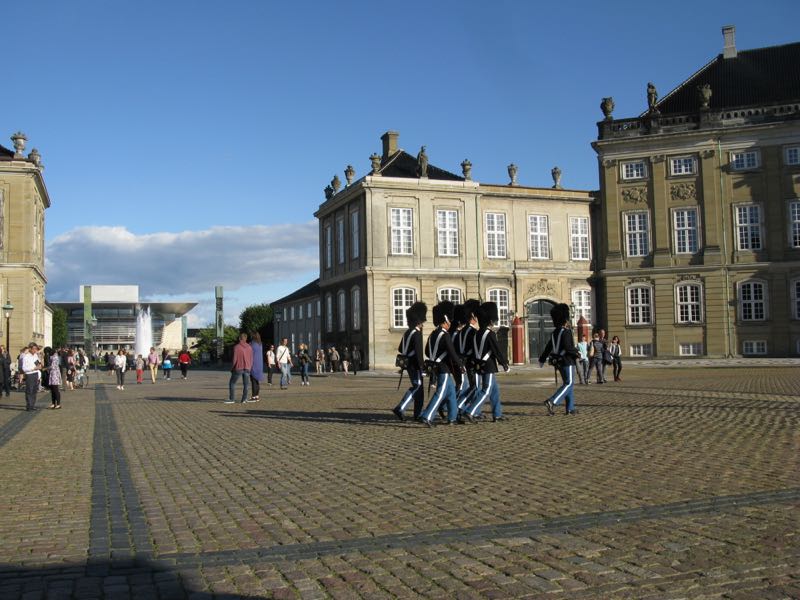 That dome in the back is the Marble Church, behind the plaza for Amalienborg Palace. We heard the clicking of steps and the calls of a marching group of soldiers and went to watch the changing of the guard.