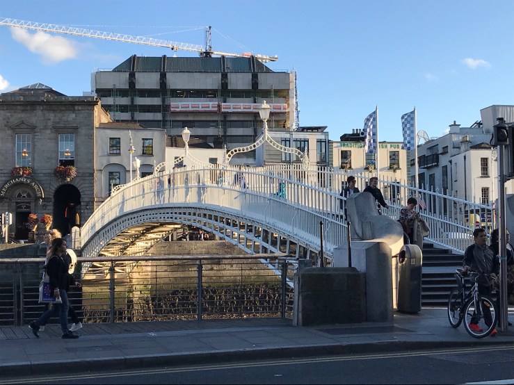 We had downloaded Google Maps Offline, which keeps us oriented even when we don’t have Wi-Fi. That kept us on target to cross the Ha-Penny Bridge, so named for the original toll, keeping Us on one side, and Them on the other side because of the steep (at the time) toll to be paid. Now it’s just a charming and well-used bridge over the Liffey.