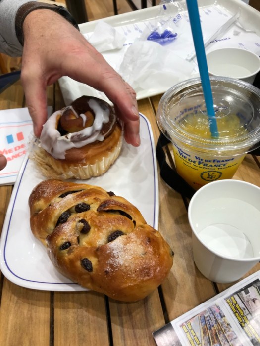 Overwhelmed, we head downstairs, and leave out the side door, find a teeny café and pause for an orange juice and a bun or two.  We watch some live “performance” of store employees grabbing walkersby, and getting them to play along, perhaps a form of engaging the customers.  Some of the employees are in Santa Claus get-ups, and everyone once in a while, they all cheer and people laugh, then they have a winner, and then it starts all over again.  We watch slightly dazed from our place in the corner, then when we finish, we walk past them on onto the streets.