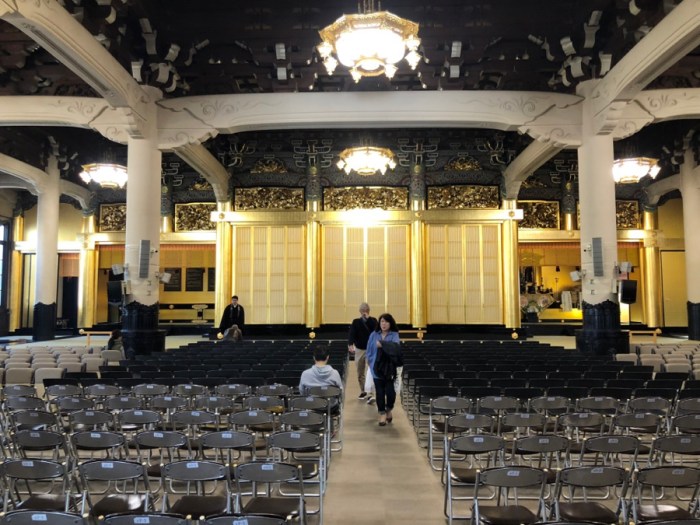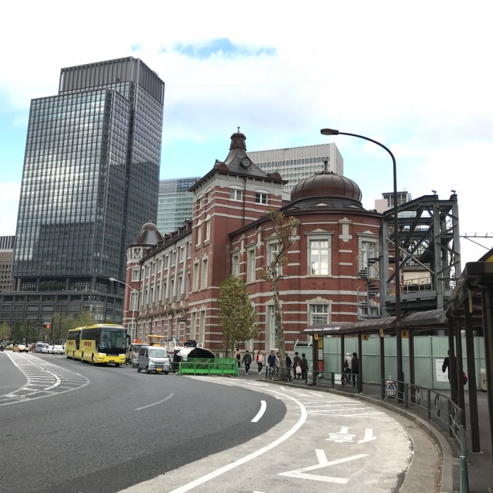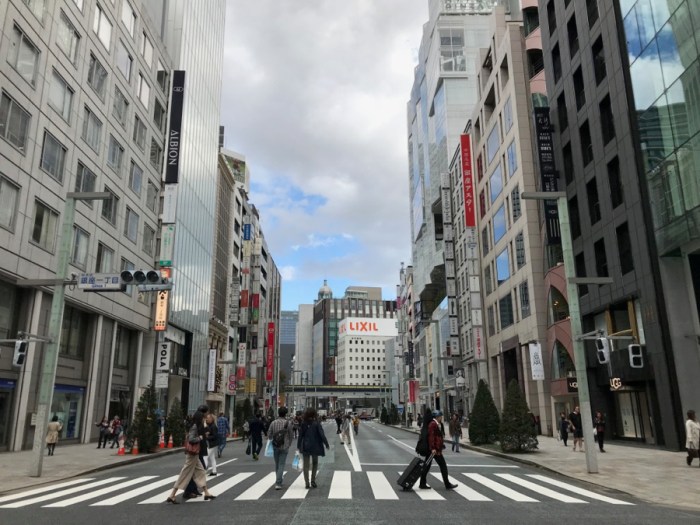Back out on Chur-dori street, there is a strange sound: no traffic. They close the main Ginza drag on weekend. It would be fun just to walk around, but we are headed to the glass building, shaped like an oblong that I glimpsed from the Tokyo Main Station.