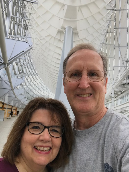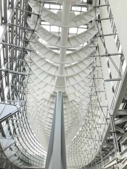 Walking in puts you at about the second level of this building. We buy our entrance passes, take the escalator down to the lowest level, then catch the elevator up to the very top of the oval glass-atrium.