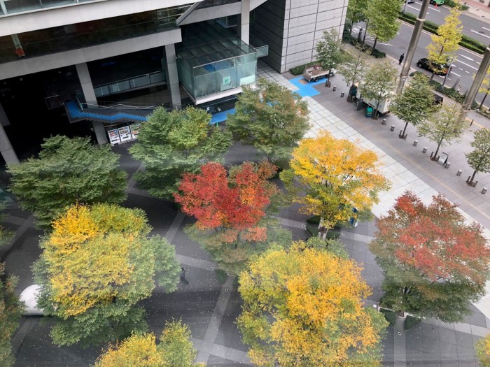 We spend some time looking around at the top, with a view overlooking at the trains gliding in and out of the Tokyo Main Train Station. This is an amazing building. In the outside courtyard below, we see the canopies of the trees turning red and gold. It’s been so warm here, that the fall colors haven’t emerged.