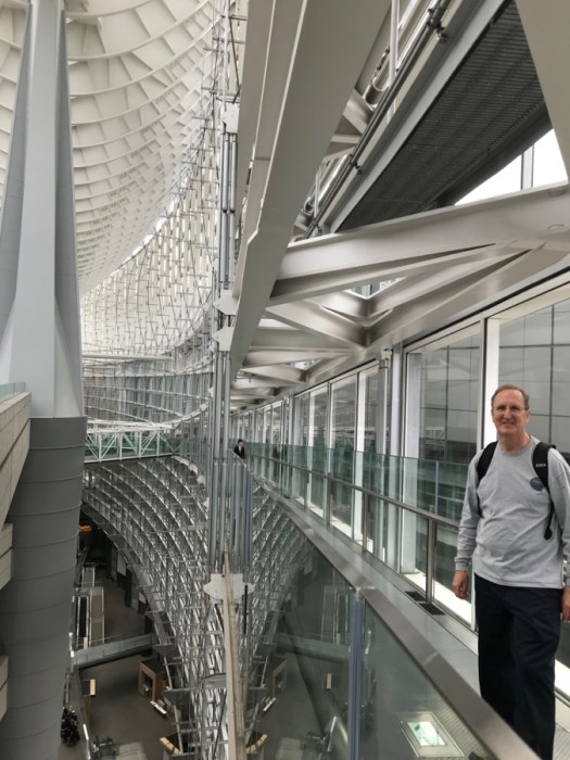 We walk along one side of the oval to the glass catwalk, then across this bridge to the other side, dropping us down one level. Through a series of catwalks, we slowly return to ground level, leaving out the opposite side of the building.