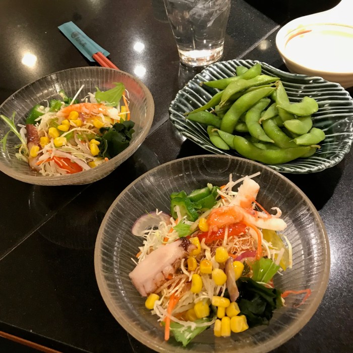 The first was some edamame, and a great little salad with shredded cabbage, lettuce, some thinly sliced radish, seaweed and bits of octopus, but I’ve learned not to be afraid of that food item here in Japan.