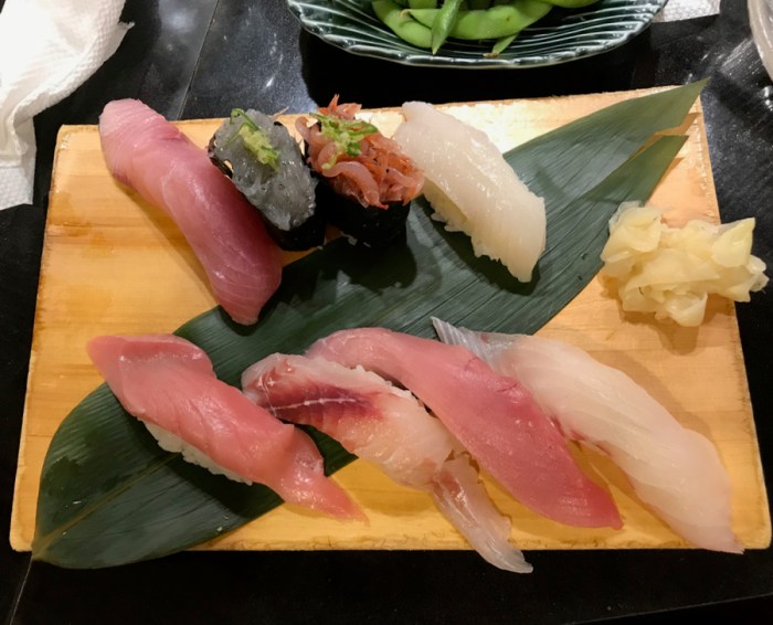We were heading to have sushi, one of the food items on my list left to try in Tokyo.  Dave had already had sushi, but now it was our turn together. We were shown a place to sit at the bar. I don’t know why I always feel in such a hurry (maybe a strange place?), but we just sort of picked the special from the main menu, a fixed array.  We sat at the sushi bar, took the requisite photos, then the food started to arrive.